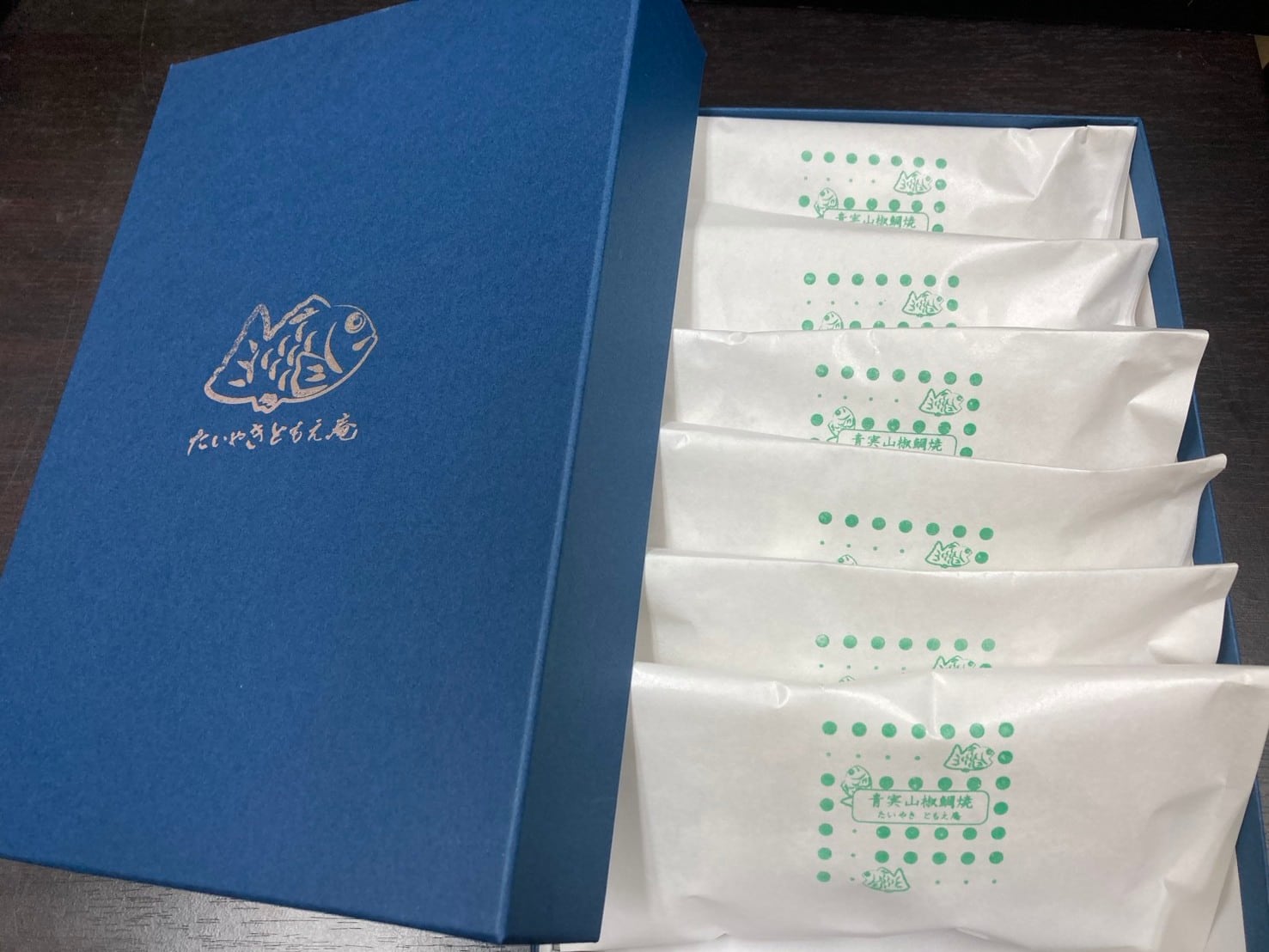 内容:おとりよせたいやき 2匹、およりよせ白玉たいやき 2匹、おとりよせ青実山椒たいやき 2匹
